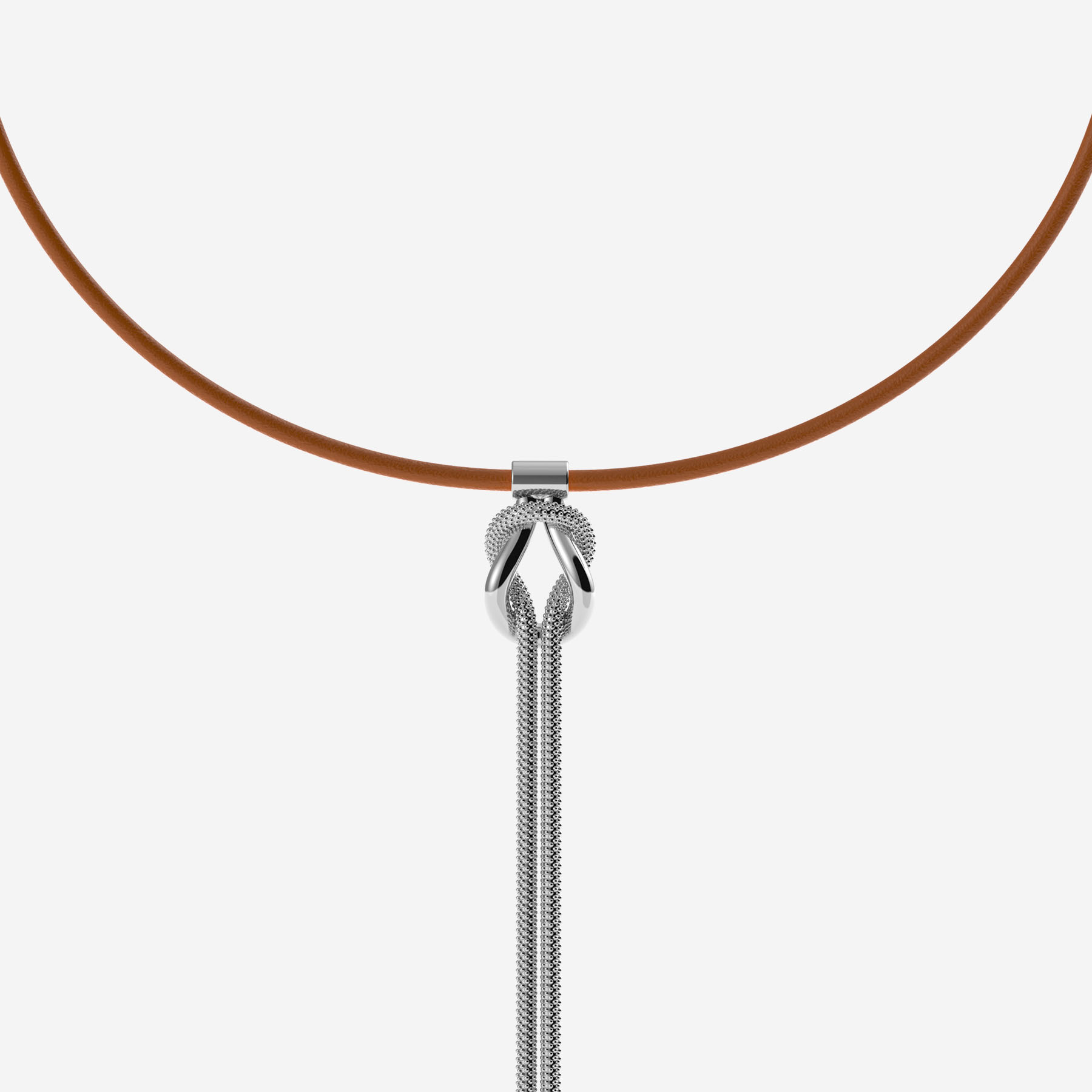 in cowhide leather with a 925 sterling silver pendant featuring a spherical texture, central knot with two drops, round lobster clasp set with a red spinel. Adjustable length with rings