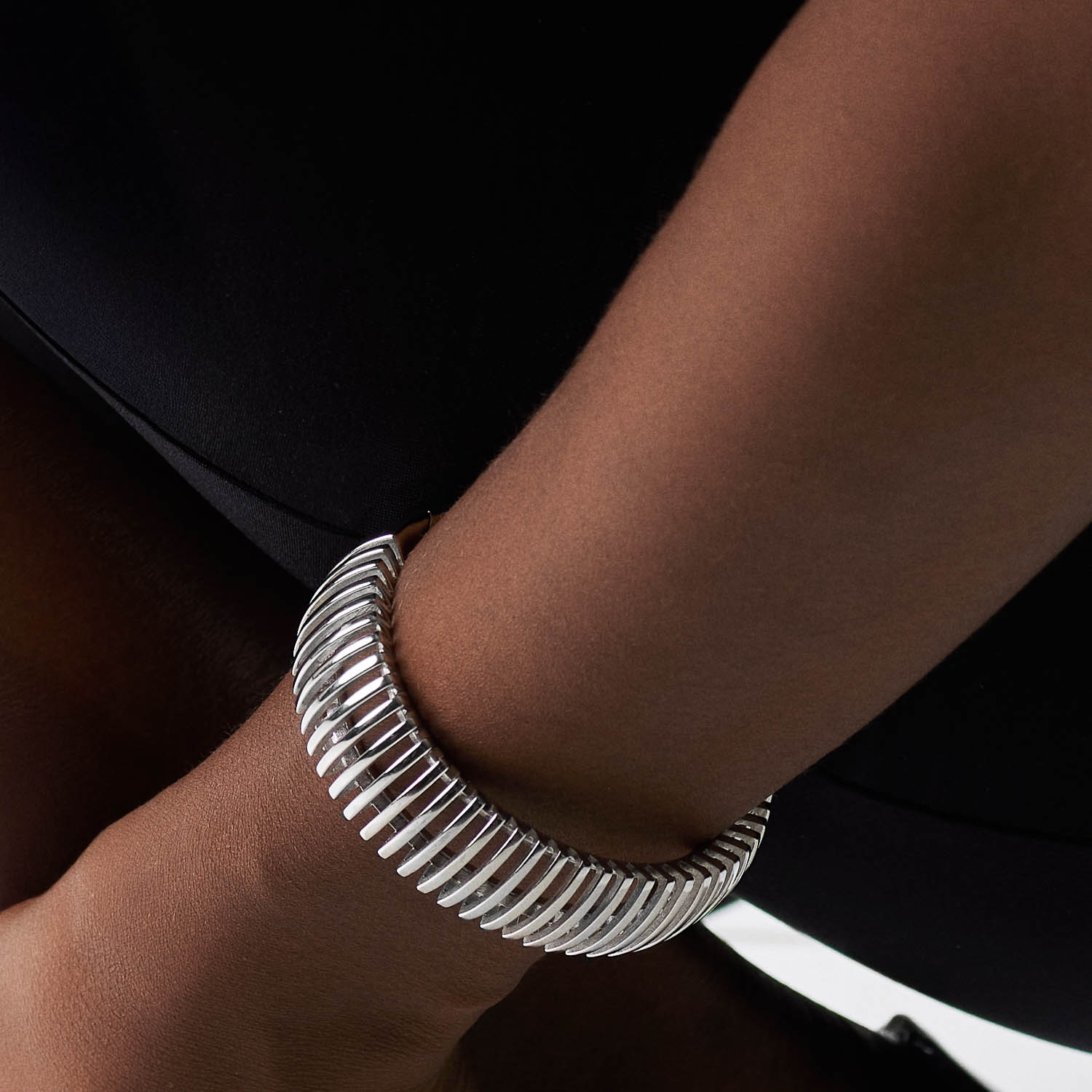The Dorifora collection in sterling silver is an interplay between material and void, where form gently dissolves into transparency, lending lightness and refinement. The metal meets light, creating shadows and reflections that give the jewelry a distinctive and sophisticated aesthetic. Architectural design and symmetrical purity inspire the collection.