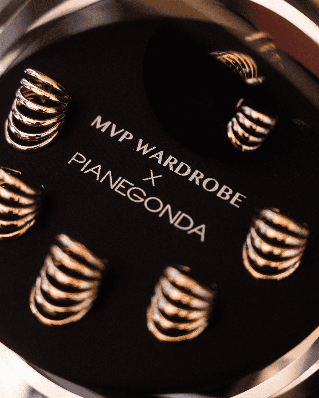 This capsule was born from an authentic dialogue between two worlds that only appear distant: the sculptural and experimental jewelry of Pianegonda and the sophisticated, contemporary aesthetic of MVP Wardrobe. A creative intertwining that explores new perspectives of style, celebrating the image of an elegant, independent, and seductive woman—values shared by both brands.